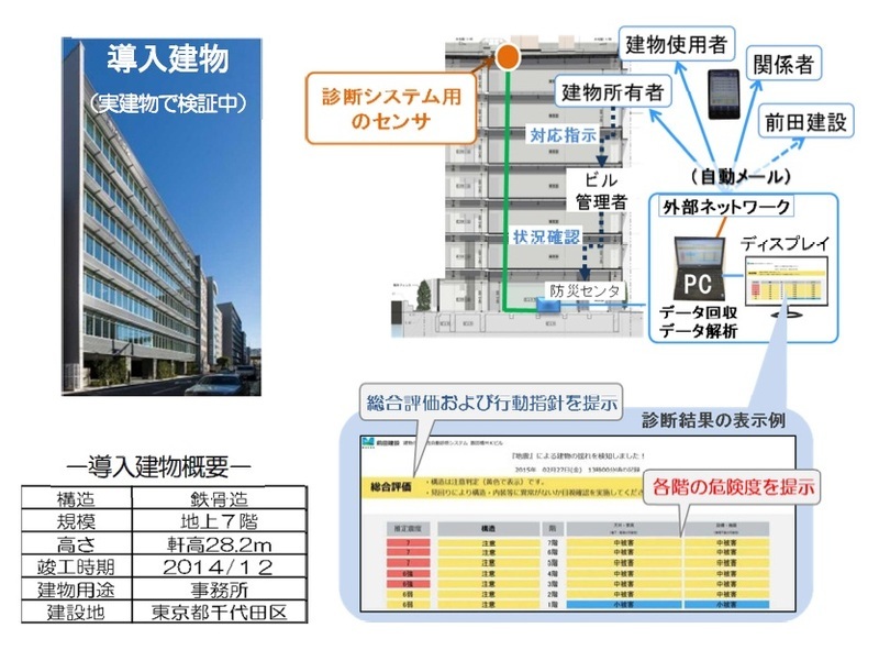 前田建設工業株式会社(本社:東京都千代田区、社長:小原好一)は、地震発生後、建物の安全性を即時に自動診断し、建物所有者や使用者などにメールで診断結果および、それに基づく行動指針を自動配信するシステムを開発しました。本システムは、既に2014年竣工の飯田橋MKビル(東京都千代田区飯田橋)への実装を終え、本年2月に実施した当社BCP(Business Continuity Plan)訓練において活用し、本システムの有効性を確認しております。特に2015年5月に発生した複数の地震において、本診断システムが妥当であることを確認しました。今後はシステムの信頼性、運用性を更に強化しながら、本システムの設置容易性と低価格を武器に、新築物件のみならず、既存建築物に対しても積極的に営業展開する予定です。