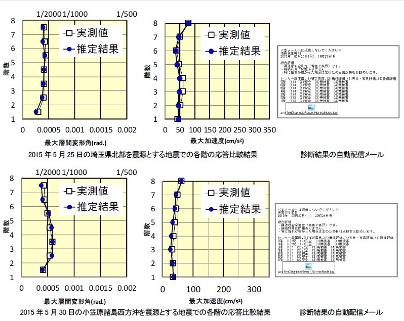 本システムは、飯田橋MKビルに実装済みであり、当社の一部従業員を対象に診断結果の配信を先行して実施しております。また、当建物ではシステム確認用に「全階」に地震計測センサを設置、屋上階1ヶ所のみの安全性診断との比較検証を行っております。結果、2015年5月に発生した複数の地震(当該地点で気象庁震度3と公表された5/25の埼玉県北部を震源とする地震、同4と公表された5/30の小笠原諸島西方沖を震源とする地震)において、地震直後の自動起動からメール配信に至るまでシステムとして適切に稼働すること、ならびに高い精度で適切に評価されていることが検証でき、本診断システムの妥当性を確認しました。